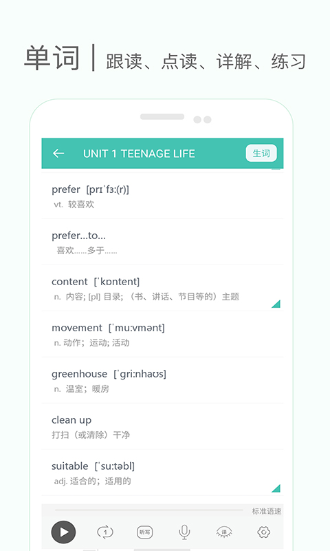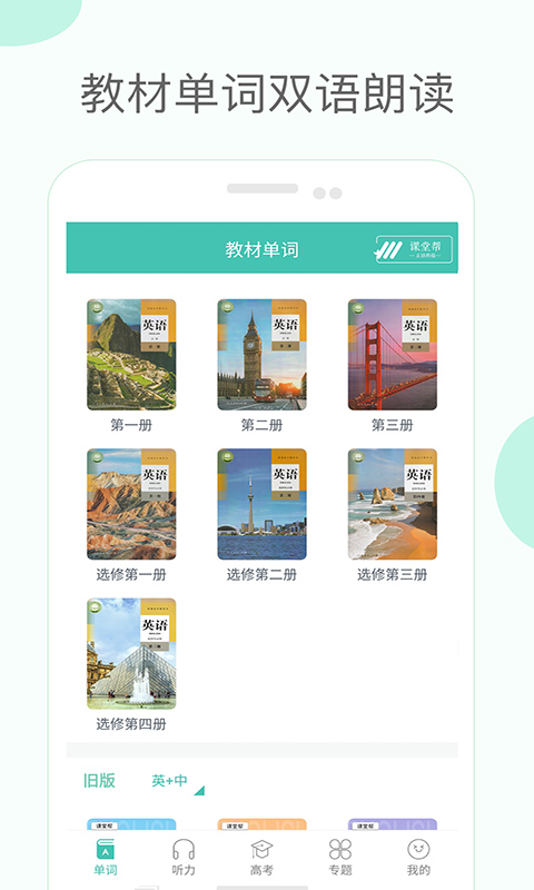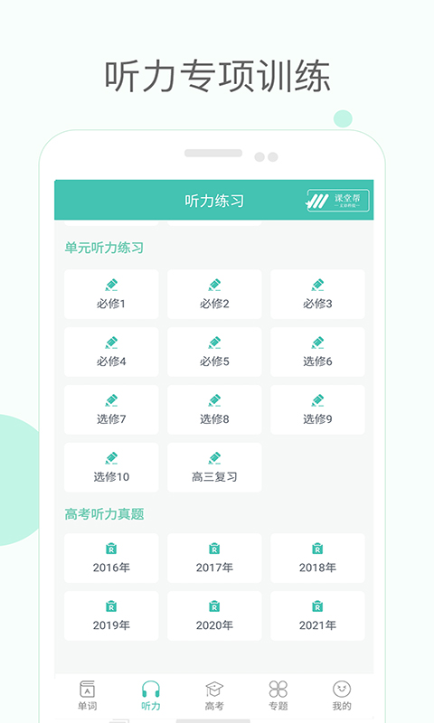 高中单词课堂 隐私政策 点击下载 (1)教材单词。高中英语教材同步学习。 (2)教材听力。每个单元对应一篇听力练习,每本教材对应一套听力综合测试卷。 (3)教材原文听读。课文精心编排,带配音、带翻译、带讲解。 (4)高考单词。高考大纲词汇乱序版,高考大纲词汇按字母排序版,高考其他分类词汇。 (5)高考听力。历年高考英语听力真题演练。 (6)高中语法大全。高中阶段所有语法内容归纳总结,重点语法有外教视频课程,全英文教学。